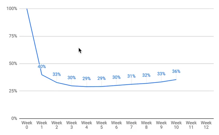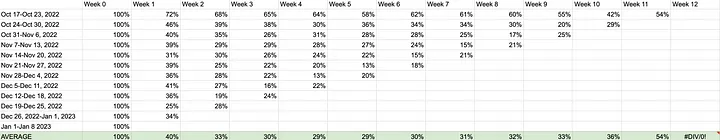 예를 들어볼게요. 아래 테이블은 12주간 활성 액션한 유저의 리텐션을 최근 주기까지 측정한 겁니다. 맨 아래 줄은우리가 최종 측정하는 값이고, 1번째줄은 Week0에 활성 액션 유저의 유지율 row, 한주씩 늘어나며 12번째줄은 week12에 활성 액션 유저의 유지율을 나타냅니다.